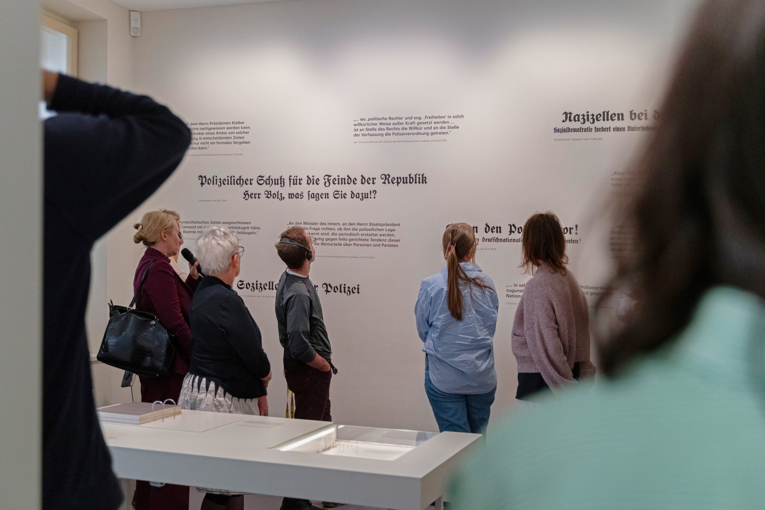 Die übergroß dargestellte Schwarzweißfotografie, die heute im YIVO Institute for Jewish Research in New York liegt, zeigt Bewohner*innen des Centers für polnisch-jüdische Displaced Persons Stuttgart-West bei einer Demonstration auf der Reinsburgstraße. Mit Hilfe von Bannern verleihen sie ihrem Protest Ausdruck. Sie hatten sich am 4. April 1946 versammelt, nachdem am 29. März der 36-jährige Schoah-Überlebende Shmuel Dancyger auf der Reinsburgstraße von einem Stuttgarter Polizisten erschossen worden war. Bereits am 2. April 1946 hatte die Stuttgarter Zeitung einen Beschluss des Oberbefehlshabers der amerikanischen Truppen in Deutschland vermeldet, der es der deutschen Polizei fortan verbot, DP-Center zu betreten.